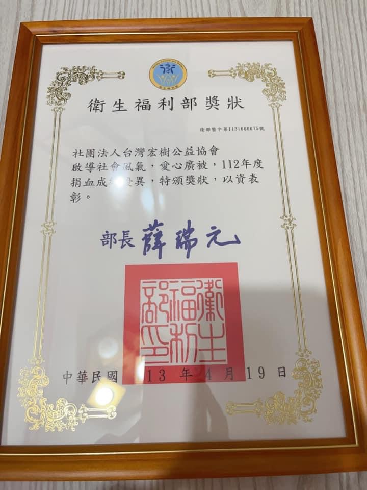 台灣宏樹公益協會榮獲112年台北捐血績優團體獎項