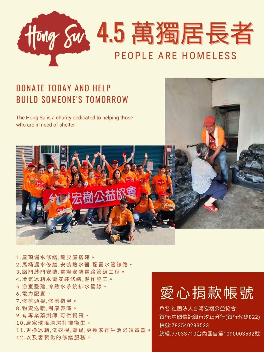 【台灣宏樹公益協會】幫助全台獨居老人房屋修繕、兒童關懷、