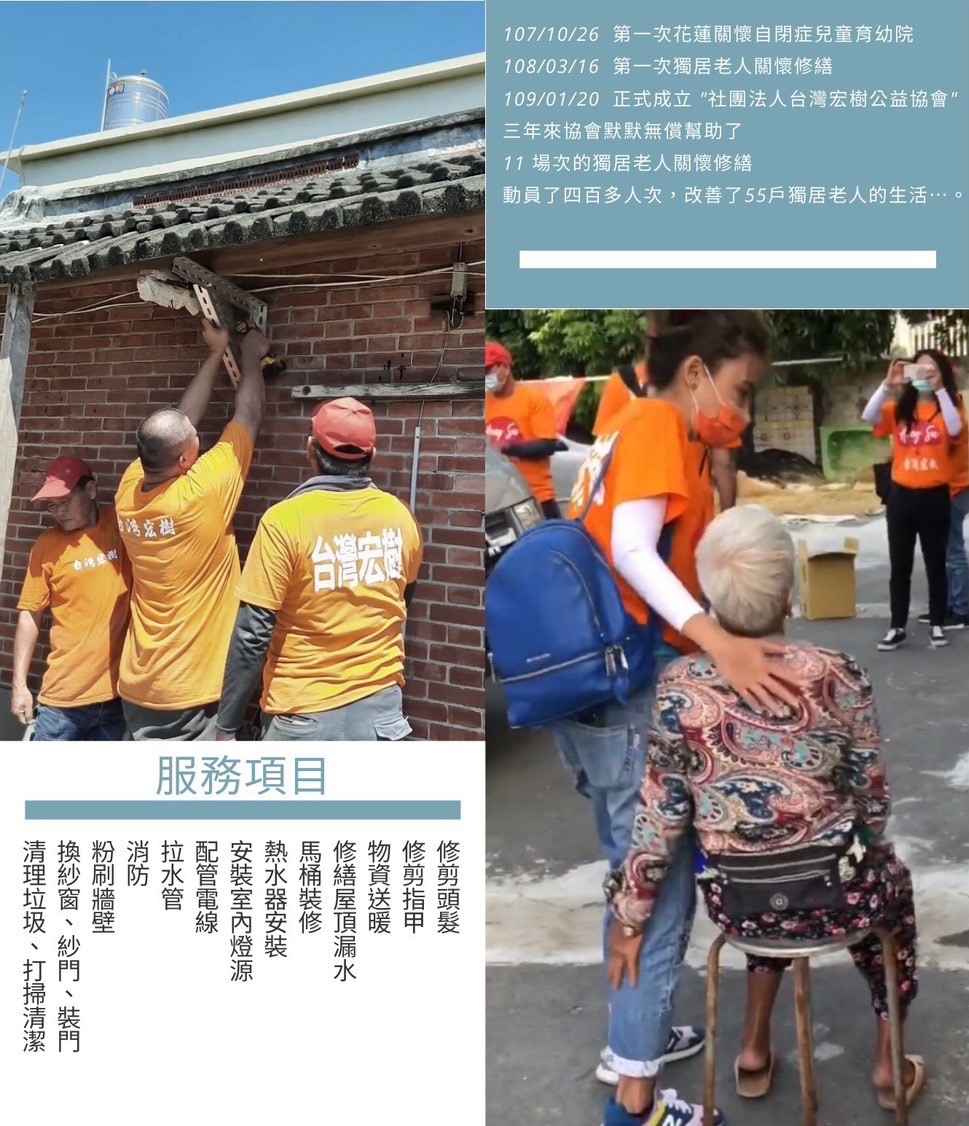 「我覺得我老了,我沒用了!」 「没想到還有一群陌生人對我這麼好!」 台灣宏樹公益活動大多著重於獨居老人關懷修繕,我們希望獨居老人能有一個更舒適乾淨整潔可以遮風避雨的家,因此我們需要更多人參與及更多方面的善款與物資。 所以我們於109年1月20號成立了社團法人台灣宏樹公益協會,讓我們可以名正言順地去邀請更多人來參與關懷弱勢族群,使我們的團隊可以更茁壯,以致於我們可以服務更多的弱勢家庭。 歷年貢獻 107/10/26 第一次花蓮關懷自閉症兒童育幼院 108/03/16 第一次獨居老人關懷修繕 109/01/20 正式成立“社團法人台灣宏樹公益協會〞 三年來協會默默無償幫助了 11場次的獨居老人關懷修繕 動員了四百多人次,改善了55戶獨居老人